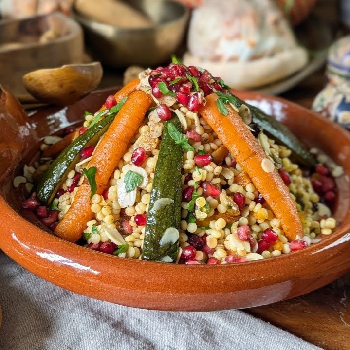 A comforting couscous prepared with fresh local vegetables and naturally sweet dates, reflecting the agricultural richness of Erfoud’s palm oases.