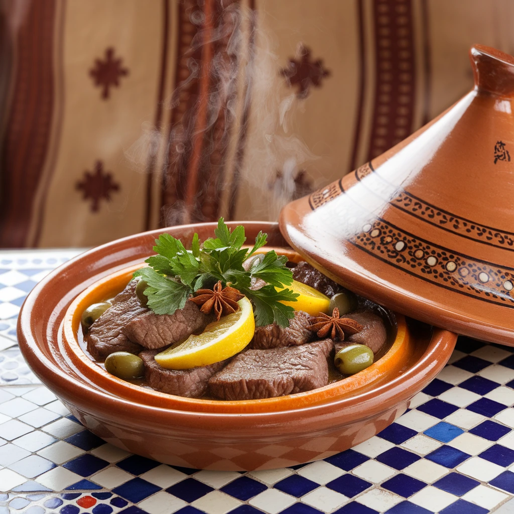 A slow-cooked tagine prepared with tender meat, dates, almonds, and aromatic spices, offering a rich and comforting taste inspired by desert traditions.